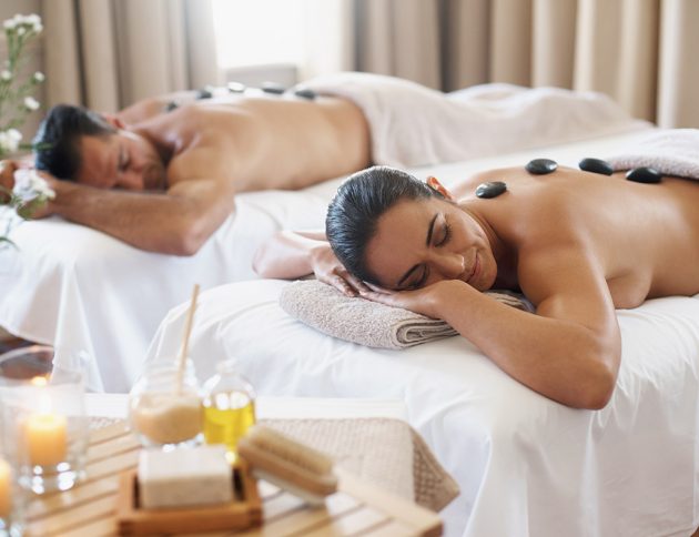 Cropped shot of various pampering essentials in a spa with a young woman in the...